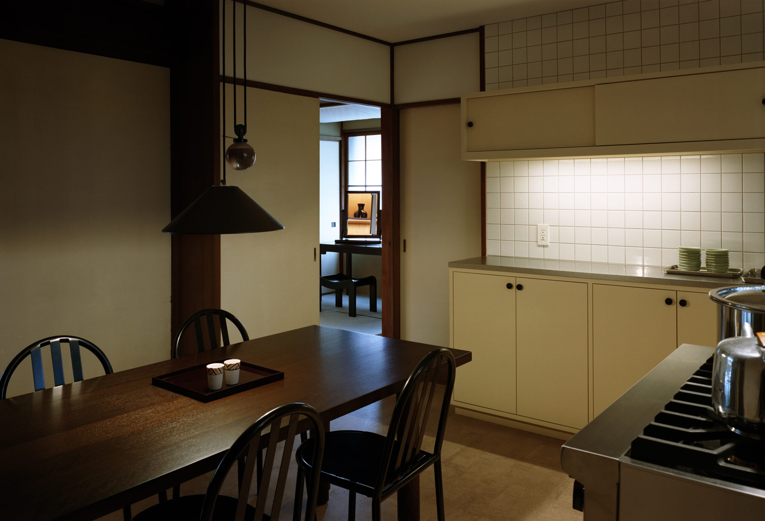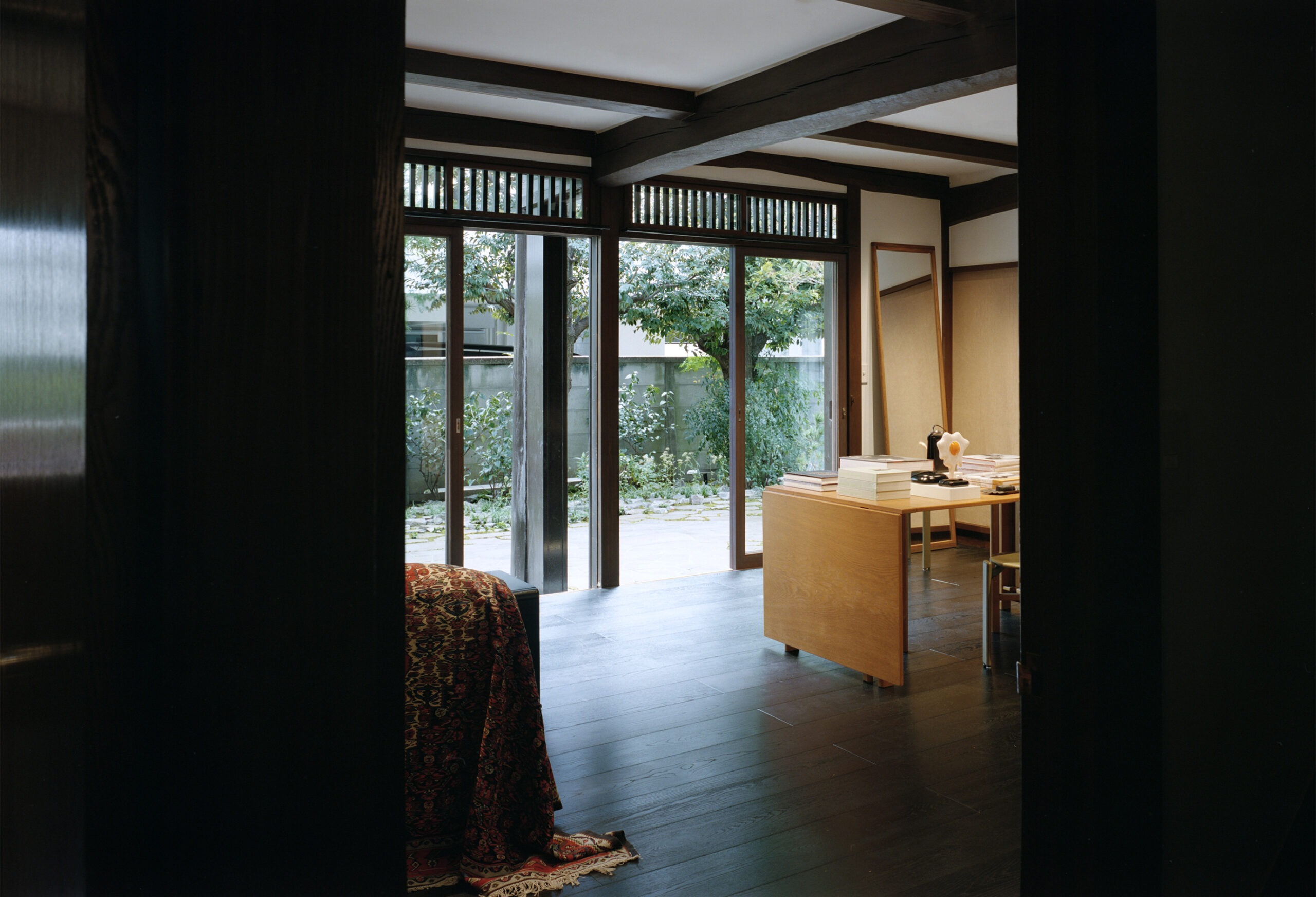 Instead of taking the space over and putting a brand stamp on it, Christophe Lemaire and Sarah-Linn Tran made sure that it blends into the design language of Japan. The walls are covered with traditional Japanese plaster while Sudare bamboo blinds handmade with straw sit alongside sliding Shoji paper screens. A series of objects that blend in with the clothes were chosen in collaboration with Out of Museum, a Japanese folk-object store in Setagaya.