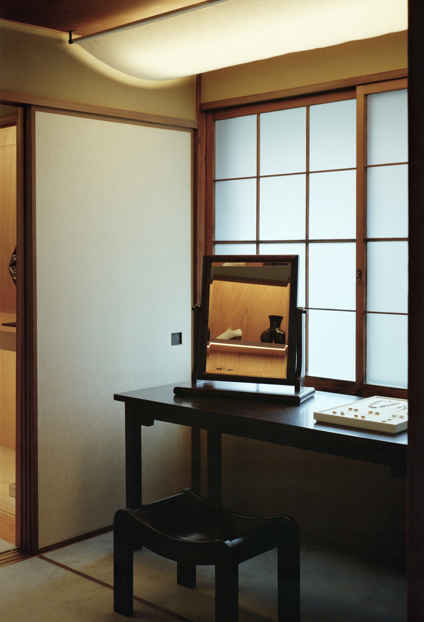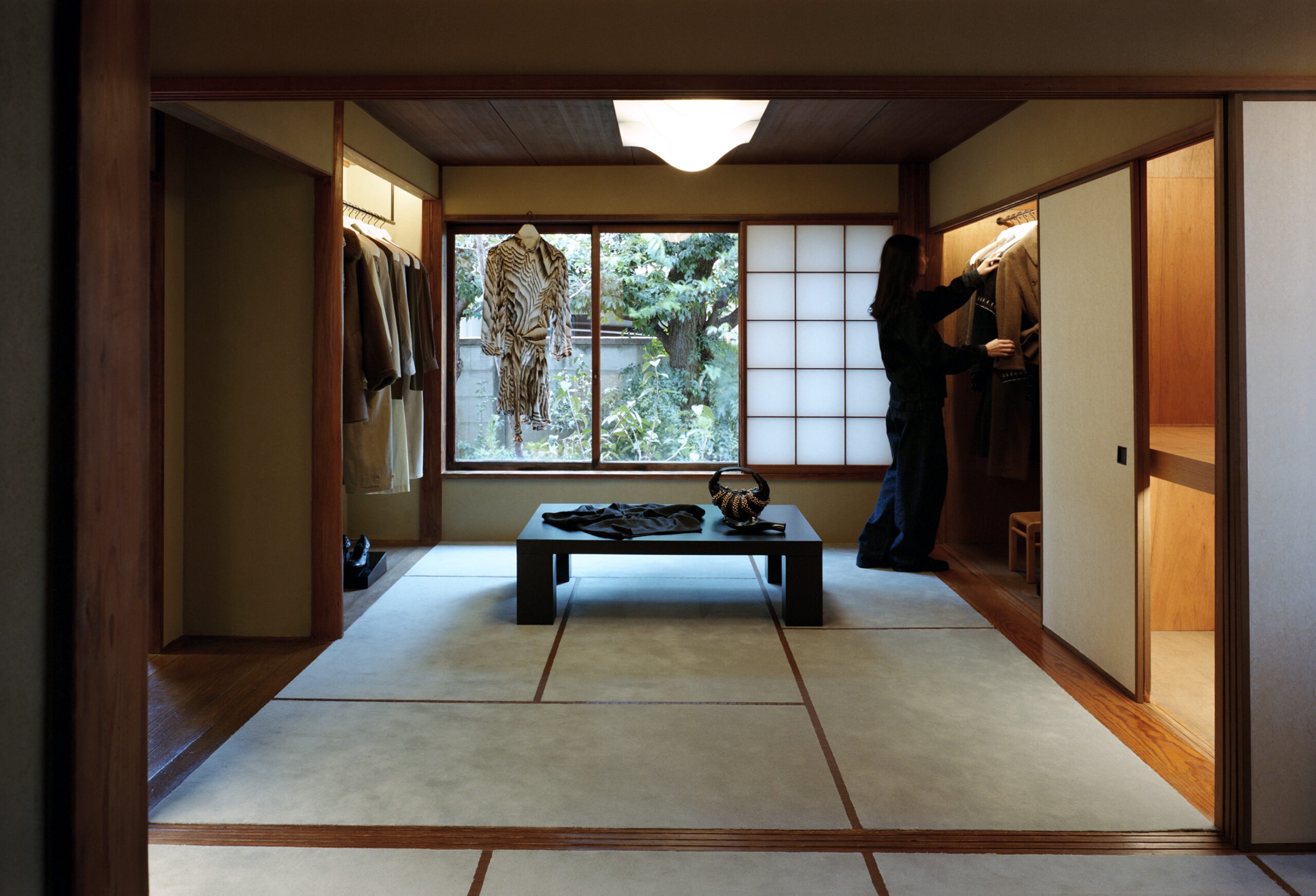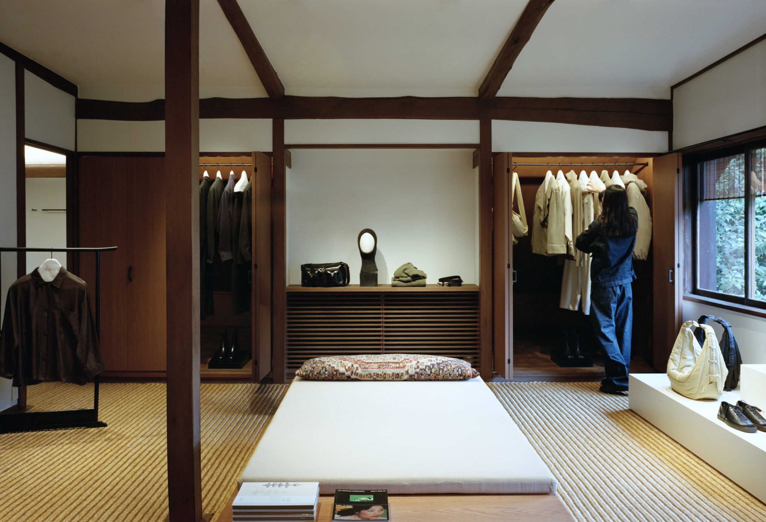 Instead of taking the space over and putting a brand stamp on it, Christophe Lemaire and Sarah-Linn Tran made sure that it blends into the design language of Japan. The walls are covered with traditional Japanese plaster while Sudare bamboo blinds handmade with straw sit alongside sliding Shoji paper screens. A series of objects that blend in with the clothes were chosen in collaboration with Out of Museum, a Japanese folk-object store in Setagaya.