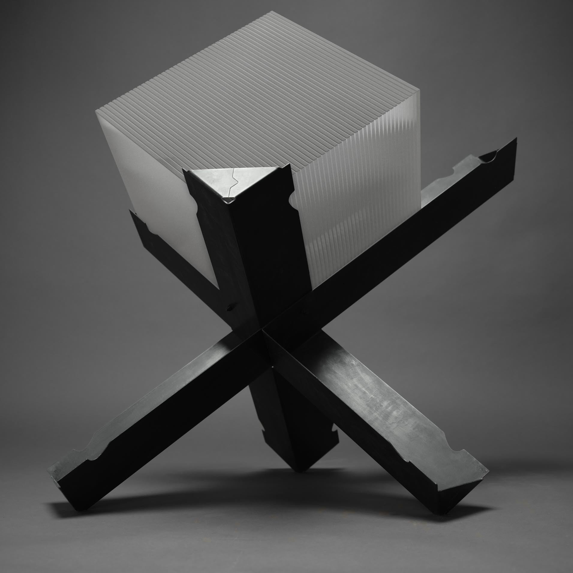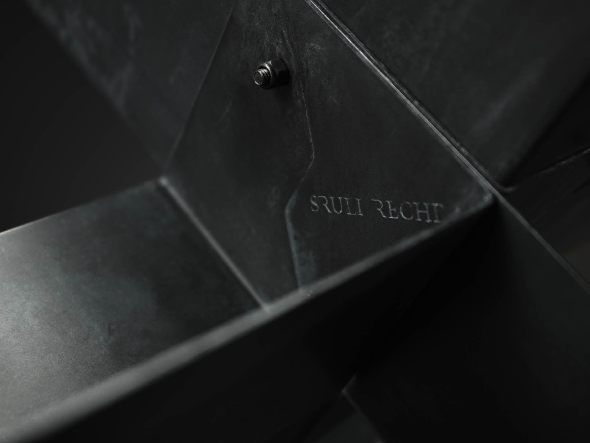 The Heavy Metal record stand is the latest release from Sruli Recht’s ongoing project, Editions. Structurally influenced by anti-tank defense obstacles, Recht alludes to the selective amnesia of a child and the healing power of the soul through music. The object, composed of laser cut steel folded using a hydraulic press then finished with acid and wax which delivers the gun black tone, stores approximately 150 LP’s.